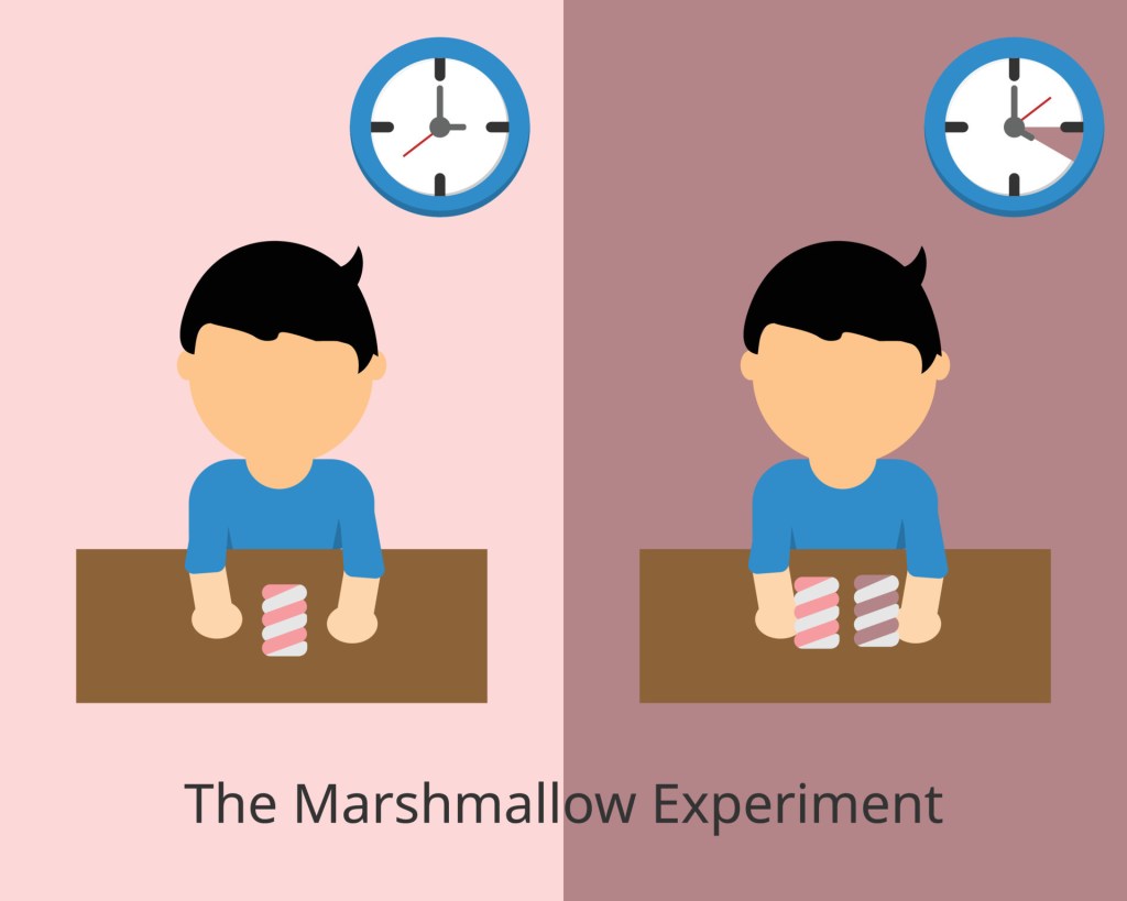 Trong một thí nghiệm tâm lý kinh điển từ những năm 1970, nhà tâm lý học Walter Mischel đã để các phần thưởng trước mặt nhóm trẻ và đưa ra một lựa chọn: Chúng có thể nhận lấy một phần thường ngay bây giờ, hoặc chờ thêm một khoảng thời gian để được hai phần thưởng. Khi nhà nghiên cứu rời khỏi phòng, nhiều đứa trẻ đã ngay lập tức ăn luôn viên kẹo, nhưng một số khác cố kìm bản thân lại, và rồi kiếm được cho bản thân 2 viên kẹo.